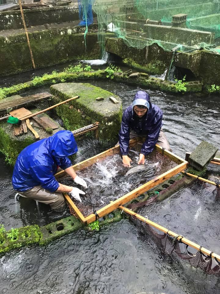 幻の尺ヤマメ選別作業 早朝6時から一人で冷たい水の池に浸かり「幻の尺ヤマメ」出荷選別作業。 私は日中会議が続くため、一人で早朝からの作業を行なってます。 8時に出勤した社員が合流しスピードアップ。 脂がのった尺ヤマメの新鮮お刺身は極上品。 全国の高級店で使われています。