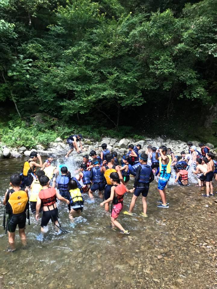 80名の子どもたちが川遊びの楽しさを体験。ライフジャケットをつけて笑顔で楽しんでいました。