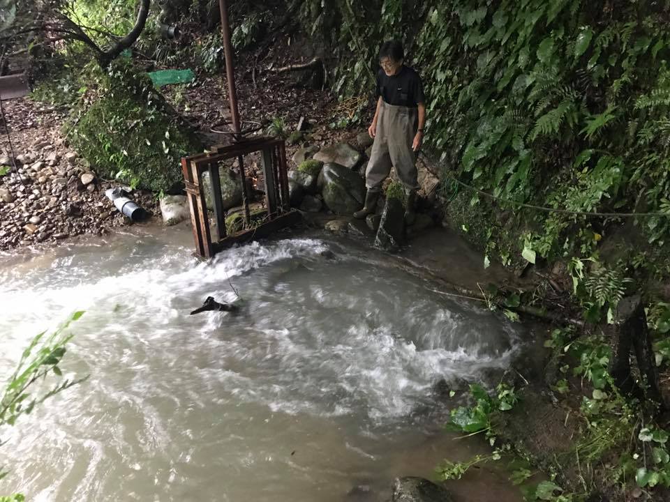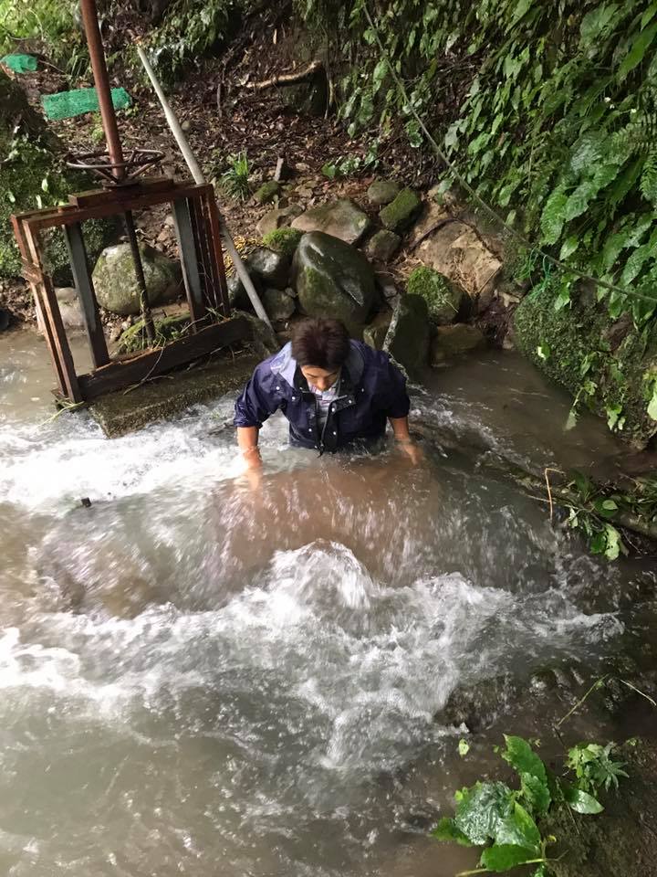 通水作業 台風が過ぎ去り朝から通水作業。 ヤマメ養殖場の水の取り入れ口の導水管に枝が引っかかっているためその除去作業。 命綱を腰に結わえての作業ですが、まだまだ水は多いので、安全第一での作業になります。 また、水門には砂利がたまっているのでその除去作業は、水圧を利用し流していきます。ただ、水の力は、ハンパないので、身体を持っていかれないように気をつけながらの作業になります。