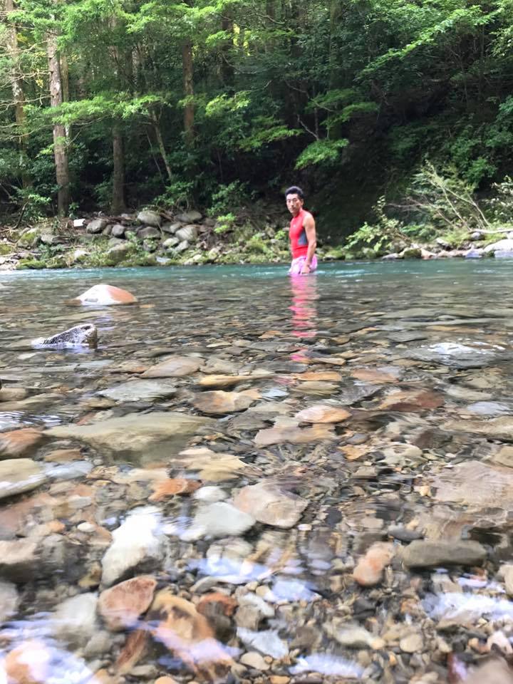 贅沢クールダウン プライベートリバーで、贅沢に独り占めのクールダウン。 早朝から祭りの準備作業で汗を流してからの〜。会社に帰ると、「ヤマメ祭り」でスタッフがパニックになりそうな慌ただしい時間。お盆の帰省客も多く、たくさんの笑顔に会えました。 そして、ようやく私のささやかな楽しみ。澄み切った渓流でのクールダウンタイム。この上ない幸せを感じる瞬間なのです。 さてこれから、明日の仕入れからの〜、町内盆祭りに来賓出席です。