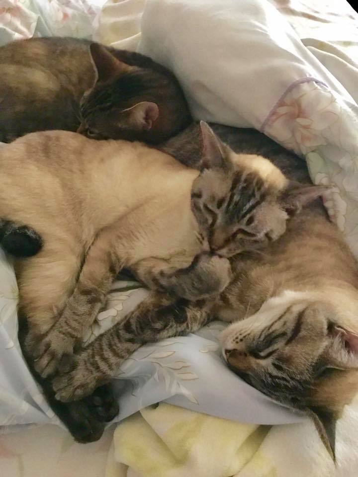 ご主人様が慌てて出て行っても、猫ちゃんたちは幸せそうに夢の中です。笑