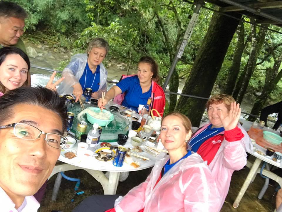 多国籍で賑やかです しゃくなげの森、多国籍で賑やかです。 BTVケーブルテレビの関係で、モンゴル、ロシア、フランスのケーブルテレビの方々が交流。 ヤマメのつかみ取りでは、ありえないほどはしゃいでアゲアゲ状態。 流しそうめんはみんな笑顔です。幻の尺ヤマメお刺身に驚愕しながらも、刺身を食べてました〜