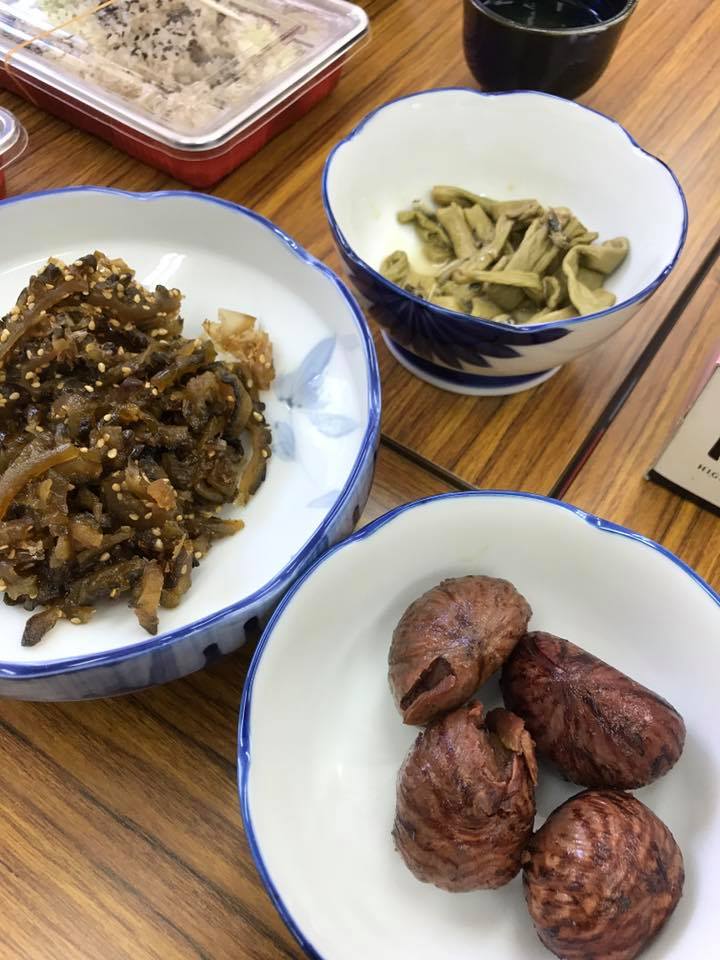 谷川で育てる山ワサビ、サトガラの煮物、ゴーヤの佃煮に、栗の渋皮煮。