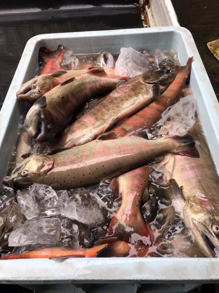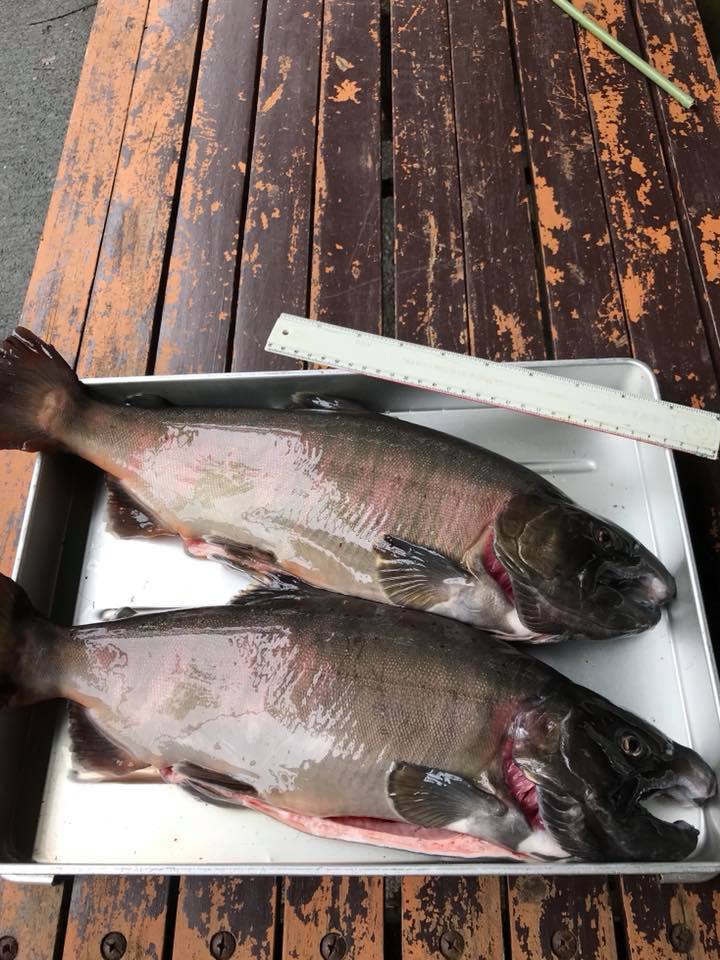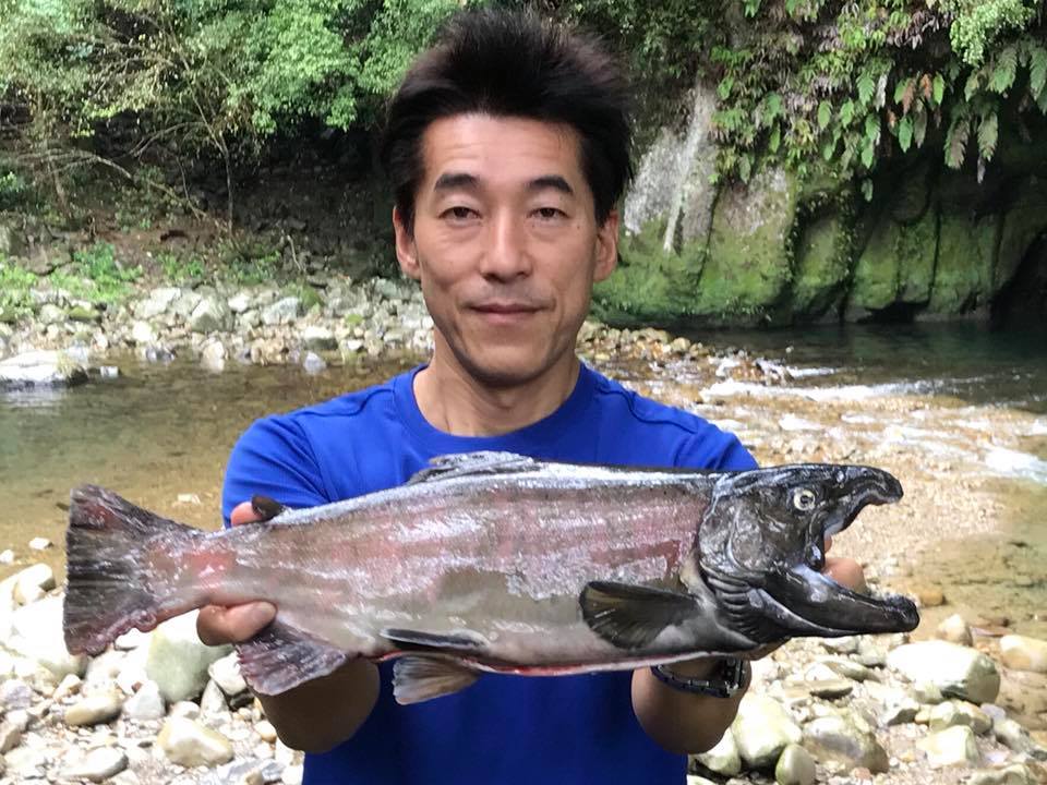 最大級の尺ヤマメ 今季最大級の尺ヤマメ、重さは2kgを超え約50cm迫力があります。 今回は宮崎市のレストラン直樹に出荷されます。 オーナーの岩崎 直樹シェフにより、グルメな方を笑顔にしていただきます。