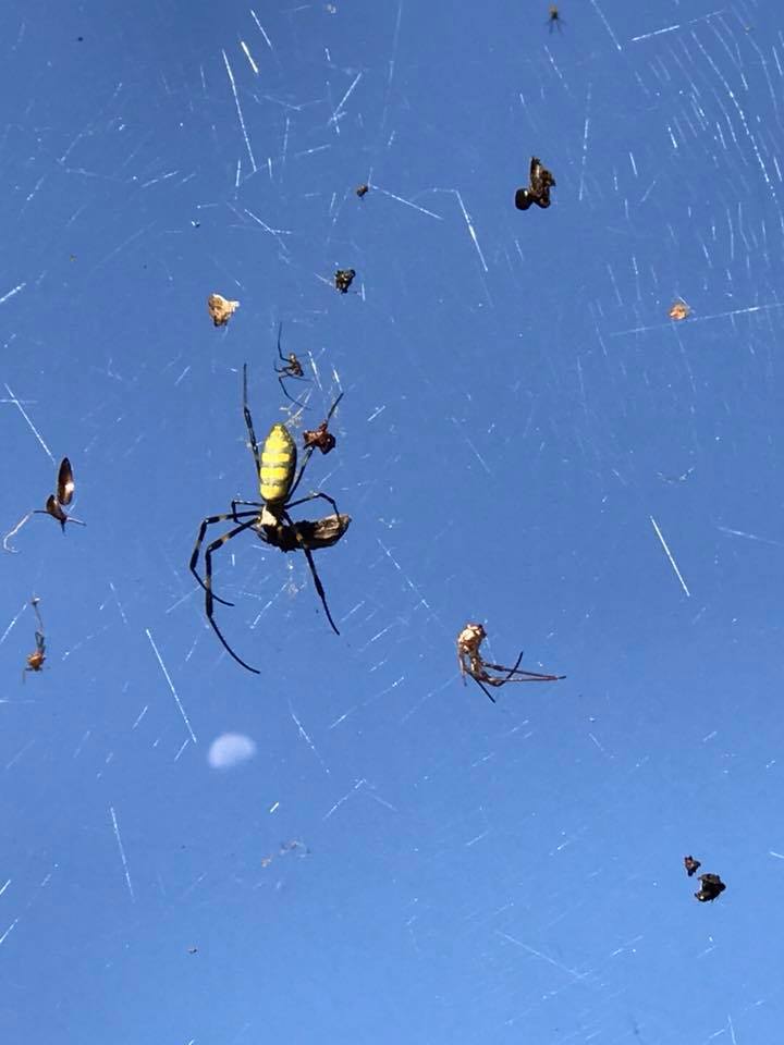早朝から生き抜くために獲物に喰らいつく蜘蛛と、静かな秋の月の対比。