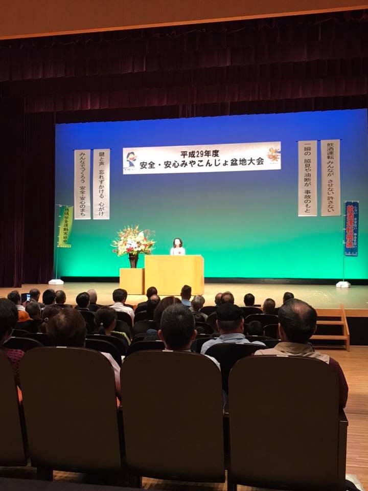 安心安全みやこんじょ盆地大会 交通安全の「安心安全みやこんじょ盆地大会」に来賓出席。 会場は約400人ほぼ満席。 永年にわたり活動を続けて来られた方々や、交通安全作文コンクールの表彰がありました。 2部では、受賞の作文を暗記して発表した小学生に拍手喝采。たくさんの方が交通安全に取り組み安心安全な地域づくりがなされています。