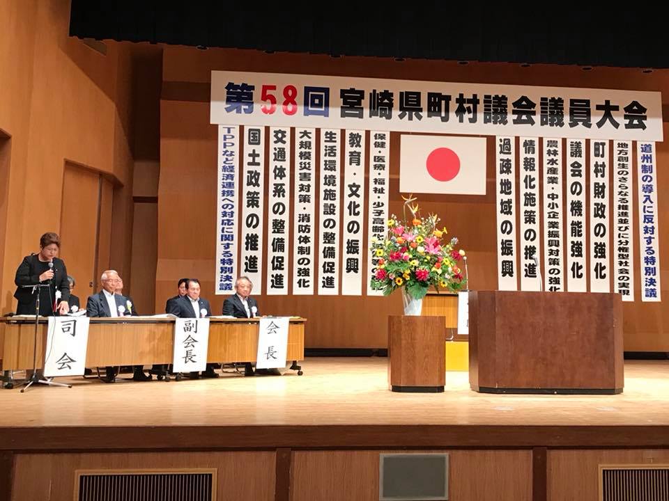宮崎県町村議員大会 宮崎県町村議長会臨時総会から、宮崎県町村議員大会に出席。 大会決議を行うための議長団の副会長に選任され壇上にあがりましたが、ほぼ座っているだけの役目。笑 議員研修会は、テレビでおなじみ政治コメンテーター川村晃司氏が講師。テーマは「政治の展望と課題」。 田中角栄氏のエピソードや、印象の面白さ、選挙の予想もあり機知に富んだ内容でした。