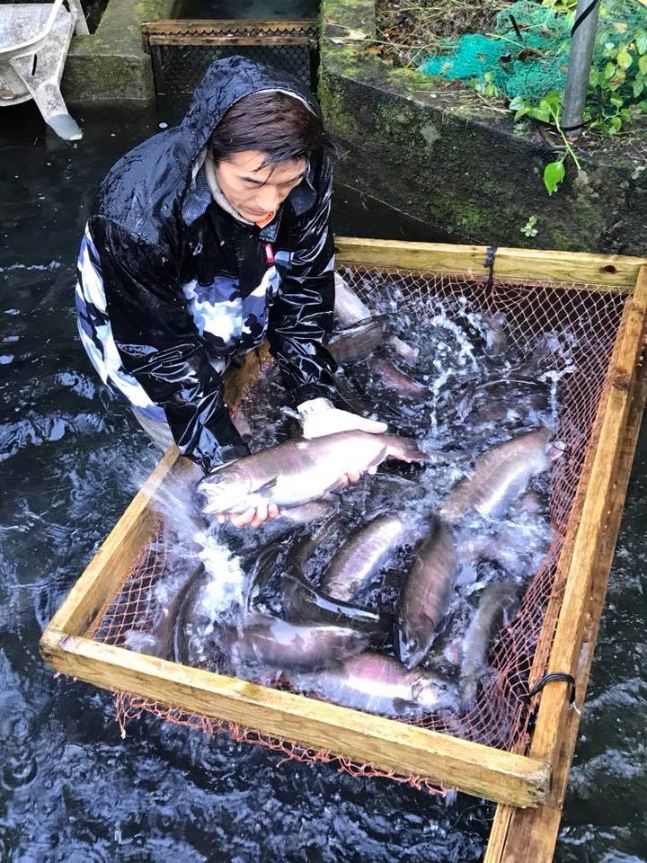 ヤマメ親魚の熟度鑑別 どんなに寒くても、この時期は早朝から池に入って禊のような、ヤマメ親魚の熟度鑑別という作業。 触診で選り分けるので熟練が必要な作業です。 美味しいヤマメづくりのスタートになる作業、もちろん黄金イクラもとれます http://www.syakunage.org/wp-content/uploads/2017/10/23052523_537238543295623_8431086450623119360_n.mp4