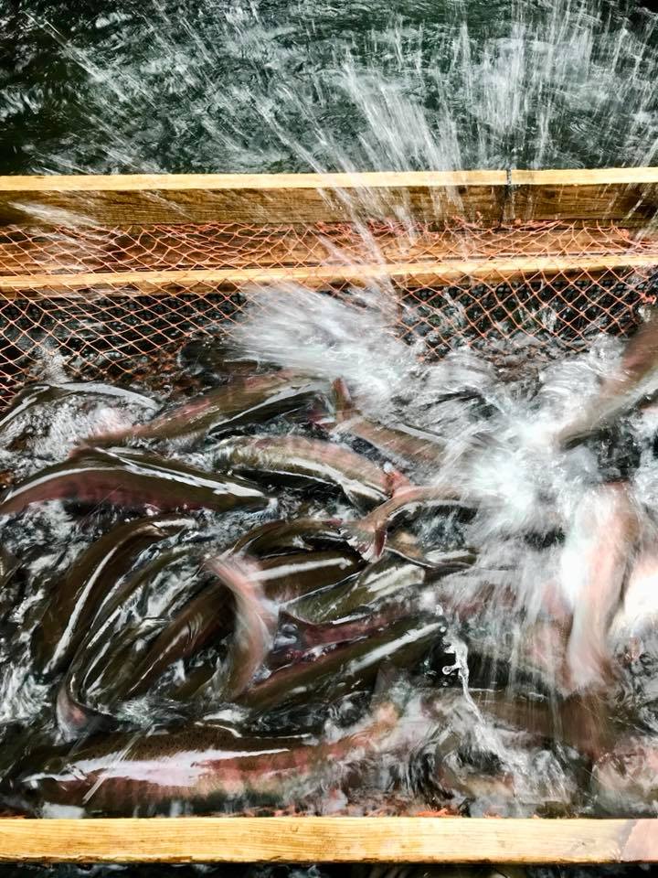 ヤマメ鑑別作業 今日も早朝からヤマメ鑑別作業です。 夢うつつで冷水に浸かり、冷たさで目が覚めます笑。 ここにきてようやく親魚の成熟が進んできました。 腰に負担がかかる作業が続くのでコルセット巻いて作業しています。