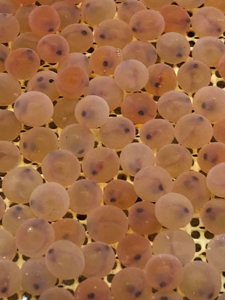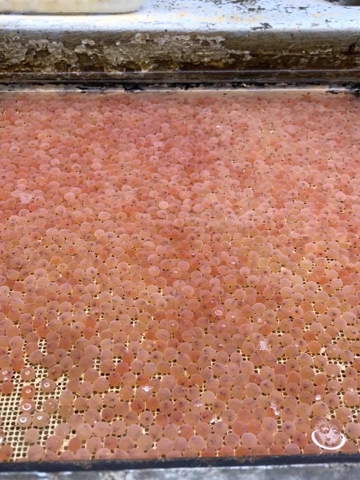 検卵作業開始 ただ今、夜中11時半、水音だけが響く孵化場で一人孤独に作業続けています。 ヤマメの受精卵が成長して発眼し、いよいよ検卵作業がはじまりました。 昼間は人工授精作業、採卵作業、加工作業、発送作業が続くので、日没からの作業になってしまいます。 親魚育成が上手くいき、特に卵質が良く、受精率がここ10年の最高となる96、7%を記録しました。 しゃくなげの森は、このヤマメ採卵、人工授精技術の高さがあるので全国に自信を持って発眼卵を販売できます。 ちなみに、遠くは北海道や東北まで販売しています。