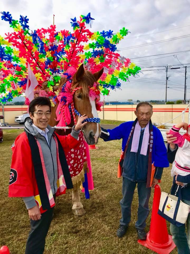 三股町ふるさと祭り、ジャンカン馬で朝から大盛り上がりです。可愛い栗姫号です。😊