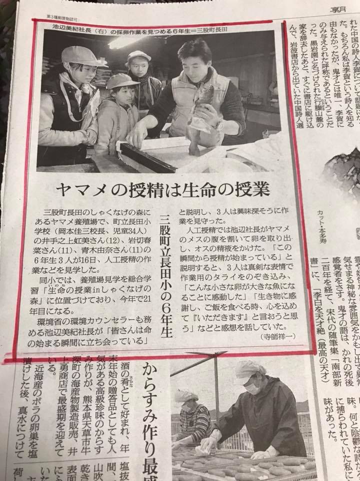 先日の長田小学校の、ヤマメ人工授精見学会「いのちの授業」の様子が新聞に4段抜きで掲載されていました。