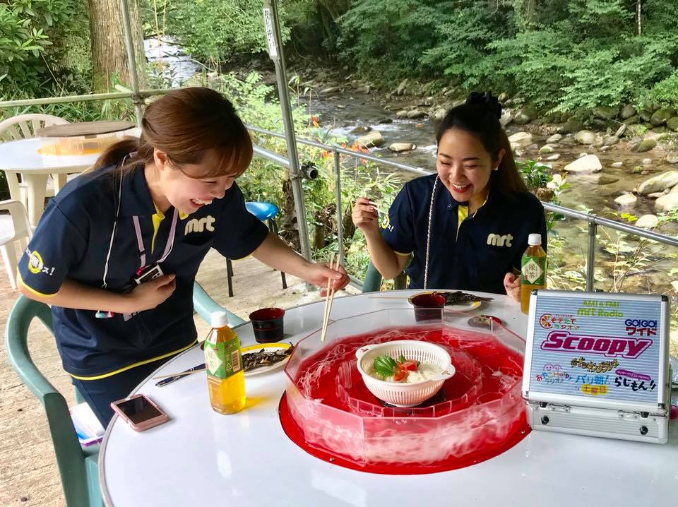 MRTラジオ、スクーピーさん来園 MRTラジオスクーピーさんが来られました。 夏のヤマメ祭りの取材です 渓流でキャーキャー、ヤマメつかみ取りでキャーキャー 流しそうめんでキャーキャー。 渓谷に歓声が響きました ヤマメ塩焼きでこれ以上ない満面の笑み。 この楽しさがラジオで伝わったかなァ〜