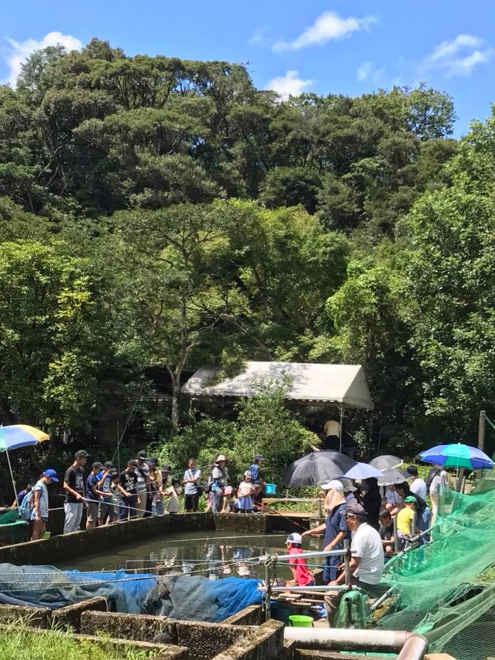 平成8月最後の日曜日、天気も良くてヤマメ釣り、つかみ取り、流しそうめん賑わっています