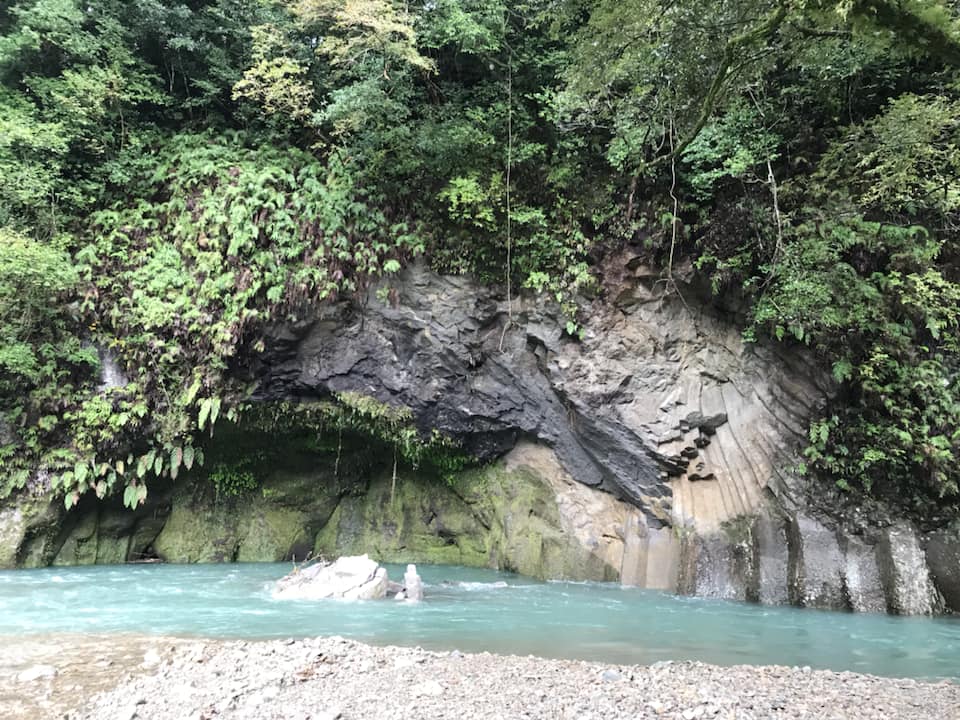 台風24号の爪痕、がくれ淵の崩落 台風24号の爪痕に愕然! 青々と深い渓流の淵が美しい、「がくれ(かっぱ)淵」で岩肌の崩落があり、以前3mほどあった淵が埋まってしまうかという状況 この場所は夏のヤマメ祭りで子供達が泳いだり、カヌー体験を開催する場所。 連続で襲来の、昨日の台風25号の影響で増水状態なので、どれくらいの水位になるか心配です。 悠久の刻で作られた断崖の崩落を見上げて、自然への畏敬を感じています。
