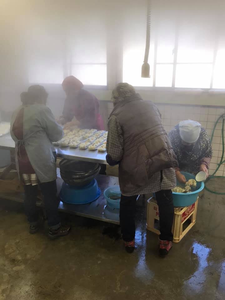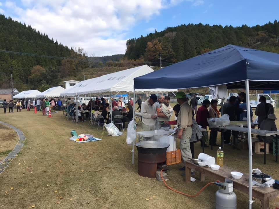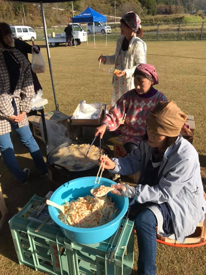 新鮮野菜も大特価、イノシシ汁300円、ガネ200円、おこわ200円。みんなでワイワイできる元気のいい地域です。
