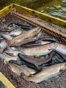 尺ヤマメの熟度鑑別作業 早朝から尺ヤマメの熟度鑑別作業を行い、ヤマメの採卵作業😊しゃくなげの森ではこの時期、食用の黄金イクラの収穫があります。 平行して、ヤマメの採卵と人工授精を行い、全国の養魚場に発送するヤマメの発眼卵作出も行っています。 しゃくなげの森で親魚からこだわって作り上げるヤマメの卵は良質だと評判がよく、全国から注文があり、遠くは北海道や東北、甲信越地方の養魚場にも出荷しています。