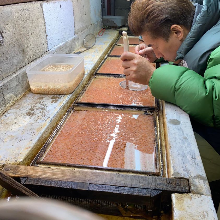 ヤマメ発眼卵の収容作業 10年振りに作り替えた真新しい孵化器と孵化盆に新しい命を入れていきます。 本日収容した発眼卵は、数日後一斉に孵化が始まります 同時並行作業でヤマメ検卵作業を行い、ヤマメ発眼卵が全国の養魚場に出荷されていきます。