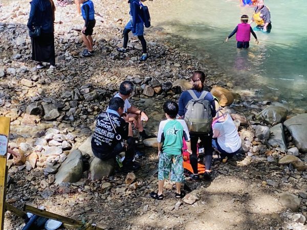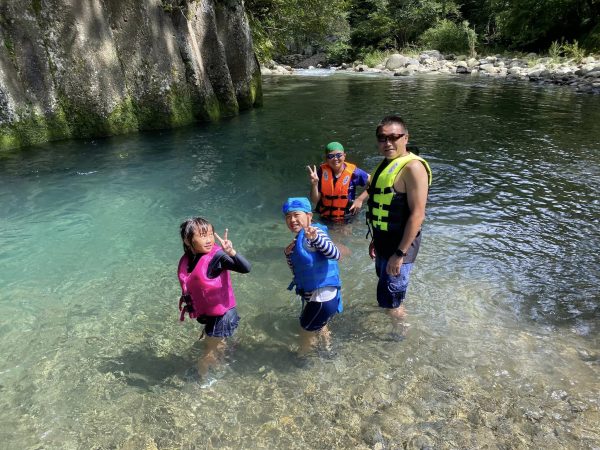 8月20日、川遊び安全教室 今日もリバーパークは大変賑やかでした 川遊び安全教室で事故事例などを伝えると、保護者も前のめりに聞いてくださいました。 冷たい渓流でライフジャケットを着て安全に活動。子どもも大人もライフジャケットを着て楽しみます。 綺麗な渓流にはたくさんの生き物がいるので、生き物観察も楽しいです。 渓流の冷たい水に浸かると最高に気持ちいいです。最初はワイワイの子どもたちも15分ほどで寒いという子が続出 ヤマメつかみ取りは連日大賑わい。今日もたくさんの笑顔が集まりました