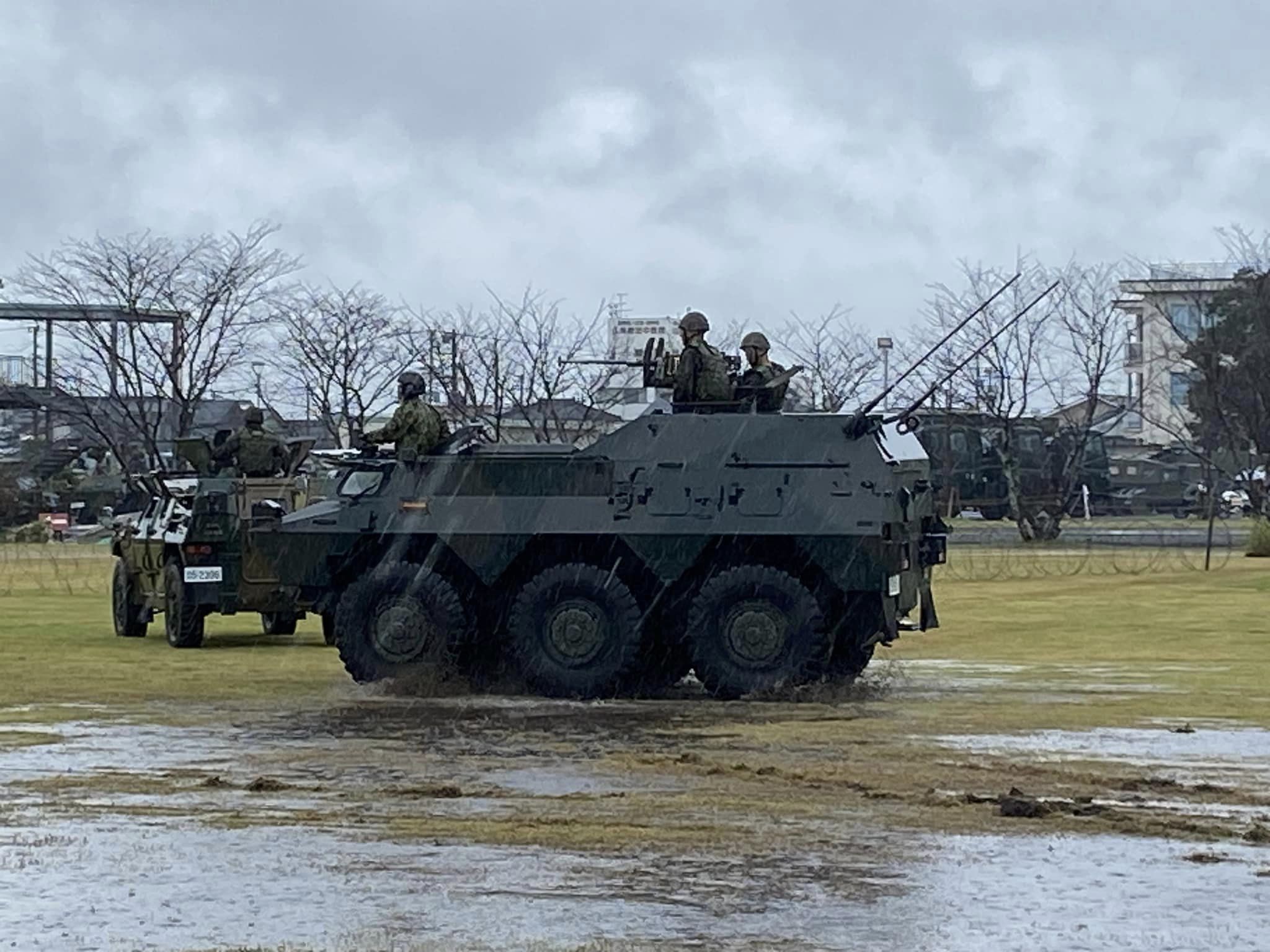 陸上自衛隊都城駐屯地開設72周年記念行事 土砂降りの中の記念式典、まさに自衛隊は雨の日も風の日もなく日本のために尽力していることを示すような天候でした。 風雨が強い中、有難いことにわたしの席は2列目の特等席。前には防衛協会青年部宮崎市支部長の大草っちが風除け露払いの如く鎮座 戦闘模擬訓練は空砲連発で圧巻! 迷彩に身を包んだ狙撃手は雨の中、ぬかるんだ場所でずっと腹這い。 空砲とはいえ銃撃音が響く訓練展示はまさに緊迫感がありました。 日本国の平和安全を守っている自衛隊に感謝しきりの式典でした。