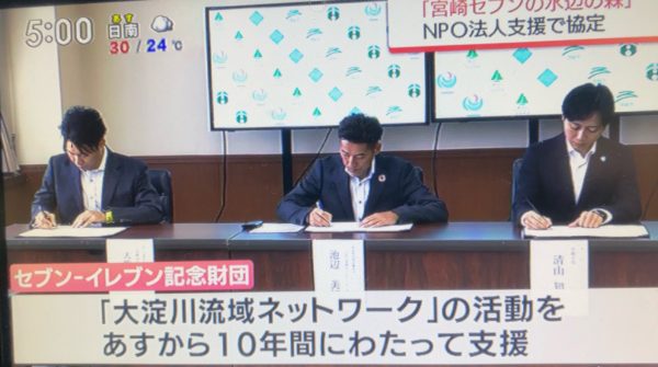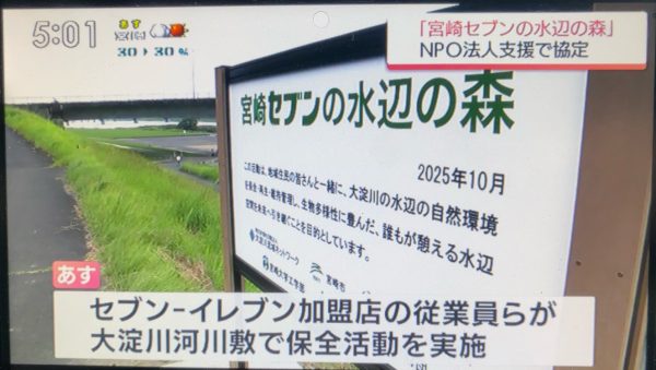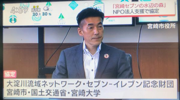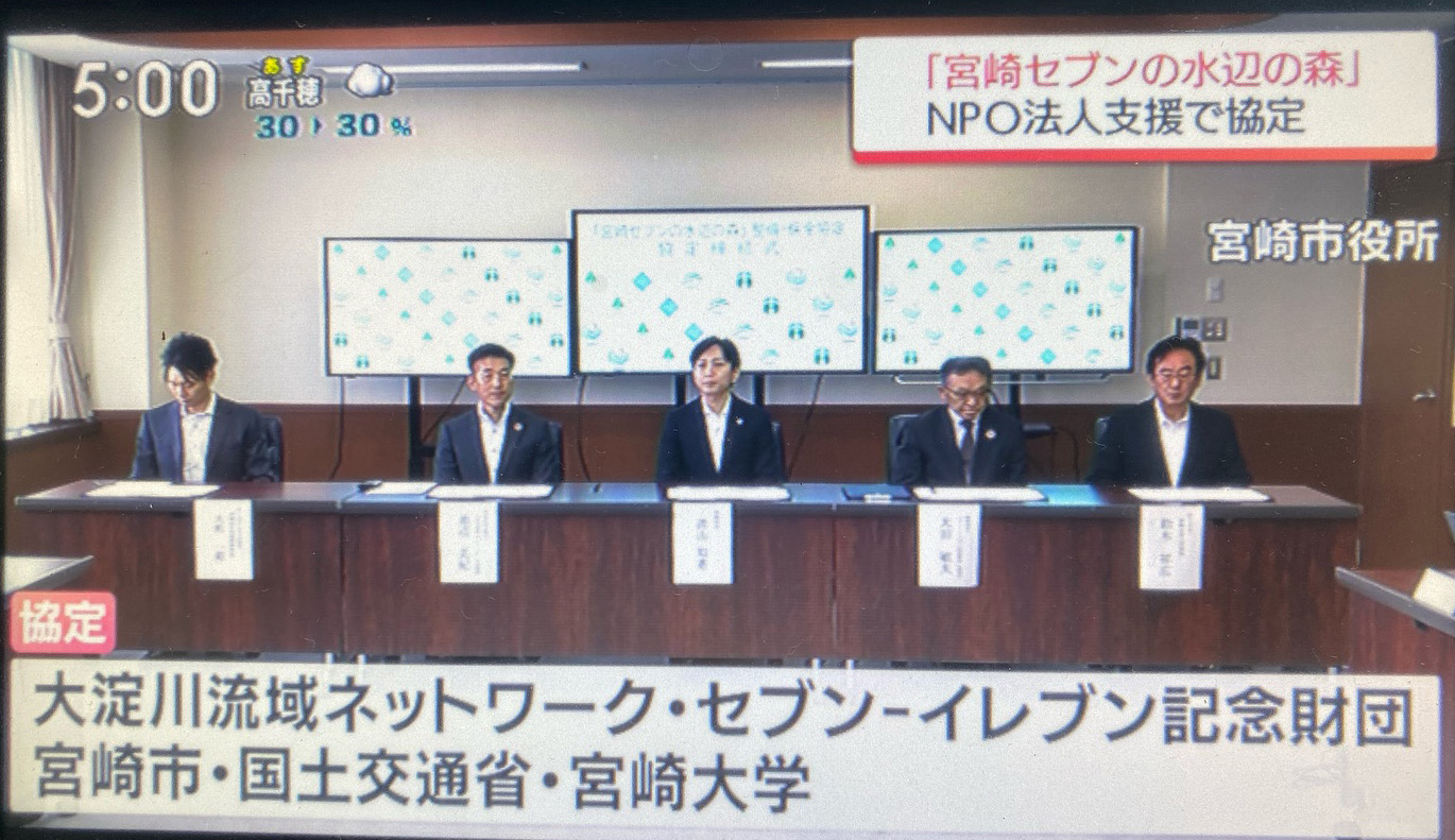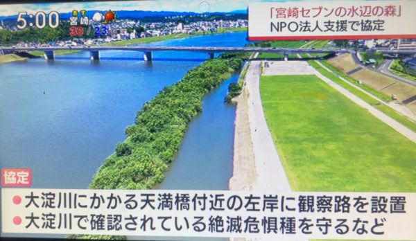 国土交通省、宮崎市、セブンイレブン記念財団、宮崎大学、NPO法人大淀川流域ネットワークによる5者による自然保護活動の連携協定。NHKやMRTテレビ宮崎で紹介されました。