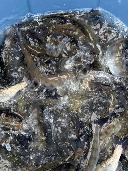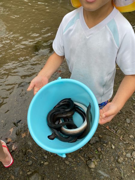 今日はモクズガニ、コイ、ウナギと一緒にヤマメを園児たちが楽しそうに放流していました。