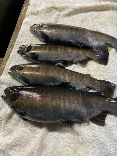 ヤマメの熟度鑑別 尺ヤマメの大きいものは、60cm2kgほどに達します。 ようやく、ヤマメの熟度鑑別の季節に入りました。 今年は、なかなか寒くならないので水温が下がらず、ヤマメの成熟が10日ほど遅れています。 しゃくなげの森のヤマメ養殖場は50年以上の歴史ですが、今年が記録的に遅い状況です。
