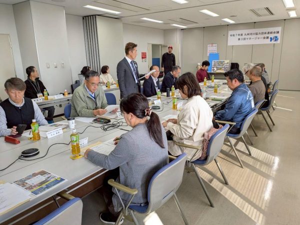 九州各地から福岡県直方市の遠賀川河川事務所の会議室に集結。九州地方整備局から工藤河川情報管理官、薄田河川環境課長の出席、歴代代表の濱崎相談役と、中村相談役も出席。会議内容は、10周年座談会の提案、川の達人制度、水難防止の取り組み、九州川のワークショップの役割確認など