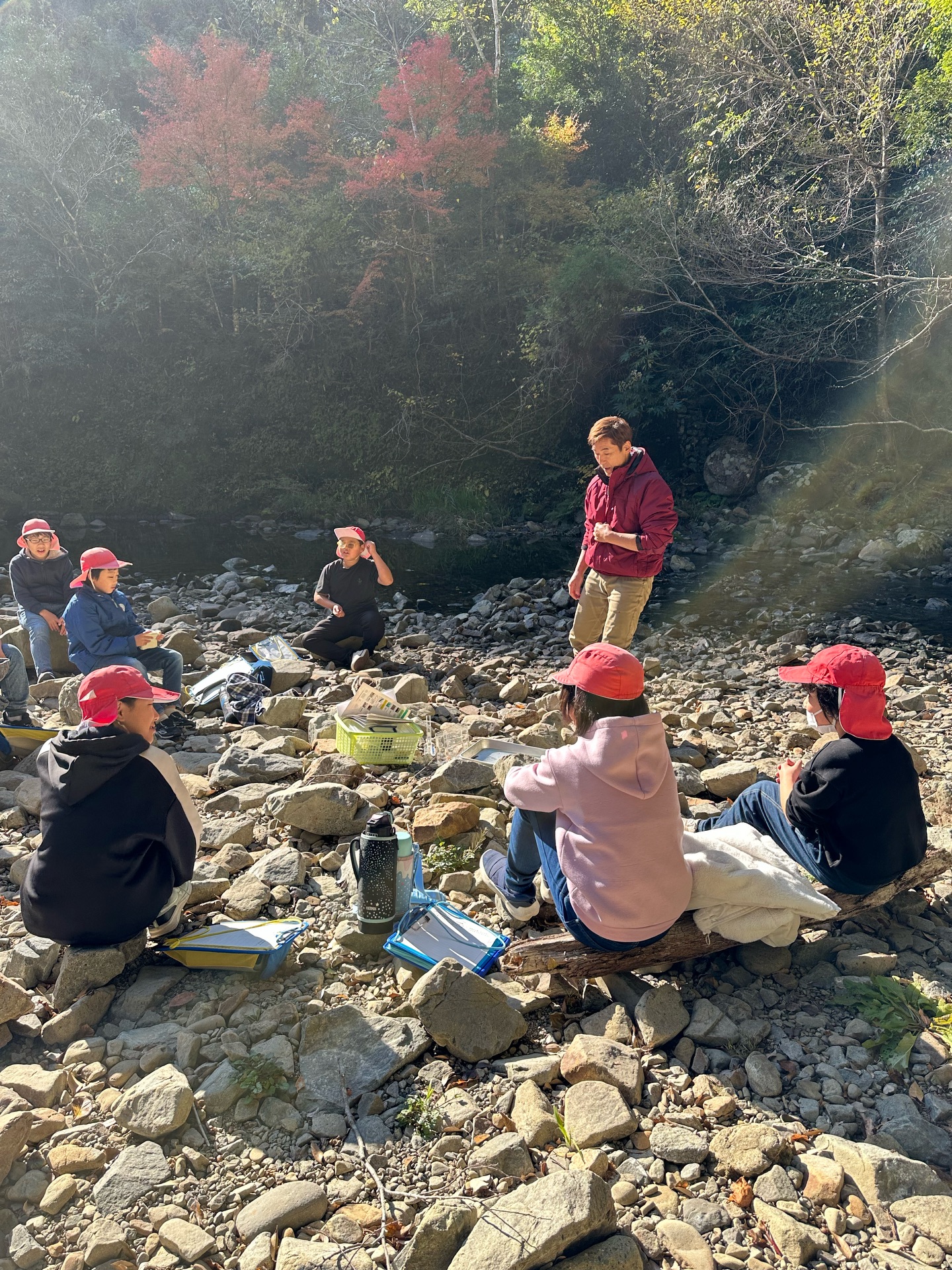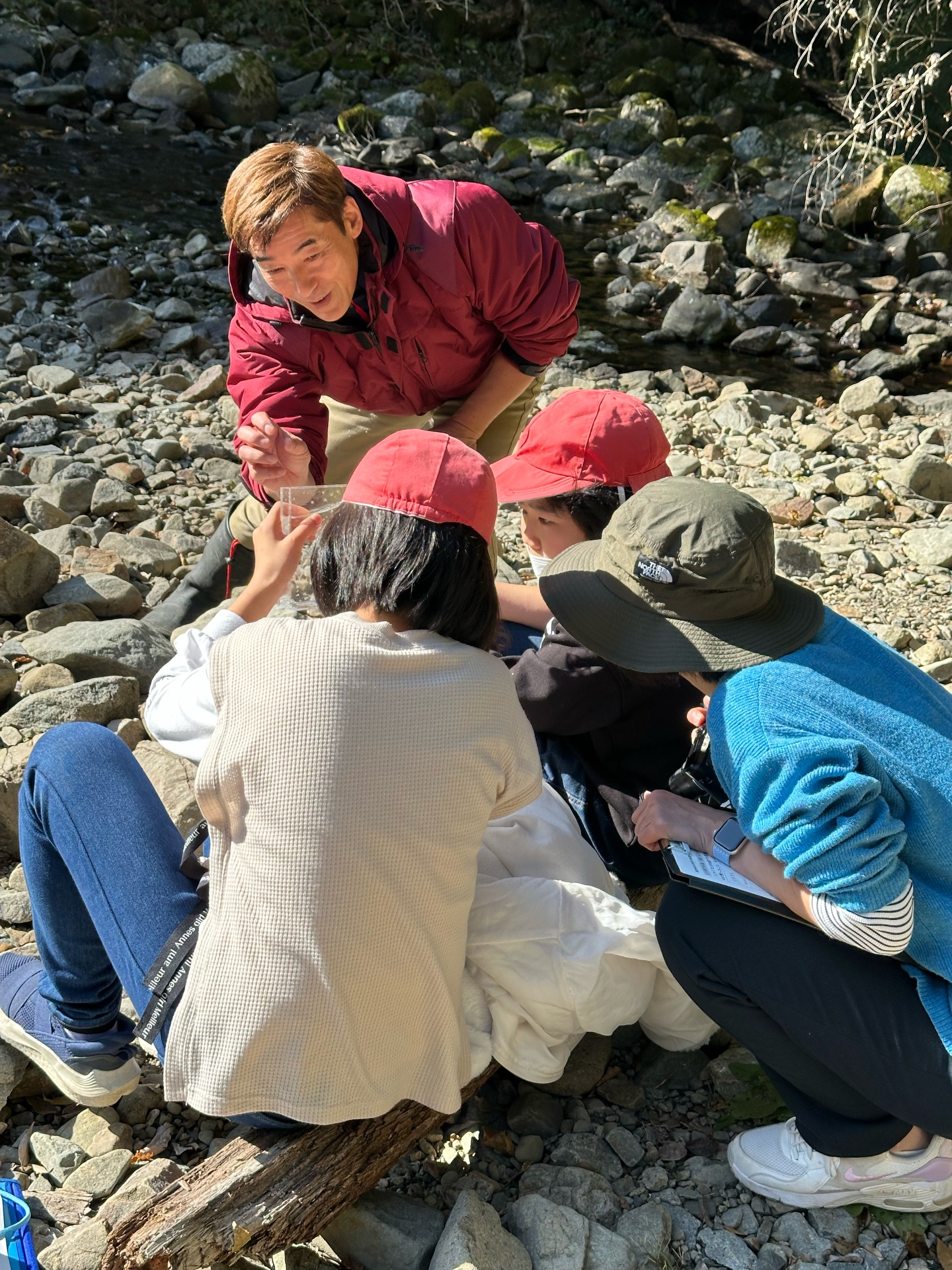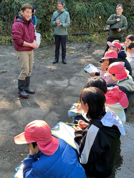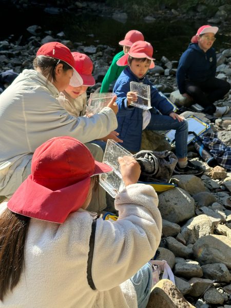 最初に、渓流で水生生物を採取し、自然の豊かさと、食物連鎖、太古からつながるいのちが目の前に広がっていることの理解を目指します。