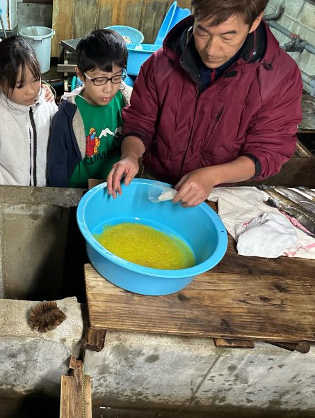 いのちの理解を深めた上で、「ヤマメの採卵」と「人工授精」を見学。