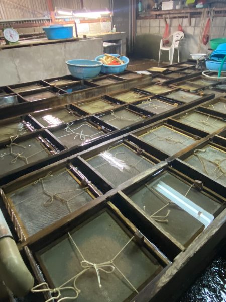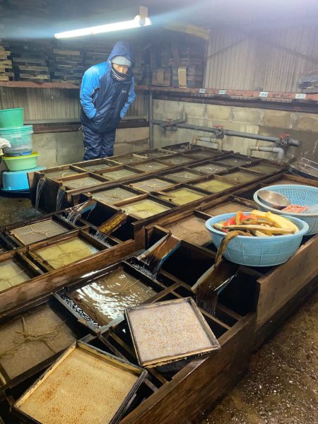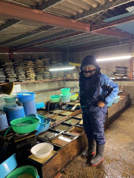 連日、ヤマメの生命(いのち)と向き合う検卵作業を頑張っています。検卵の作業場は足元には水が流れる冷たい場所。