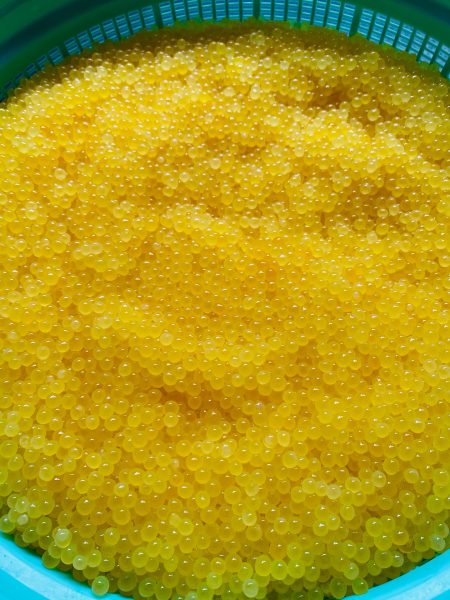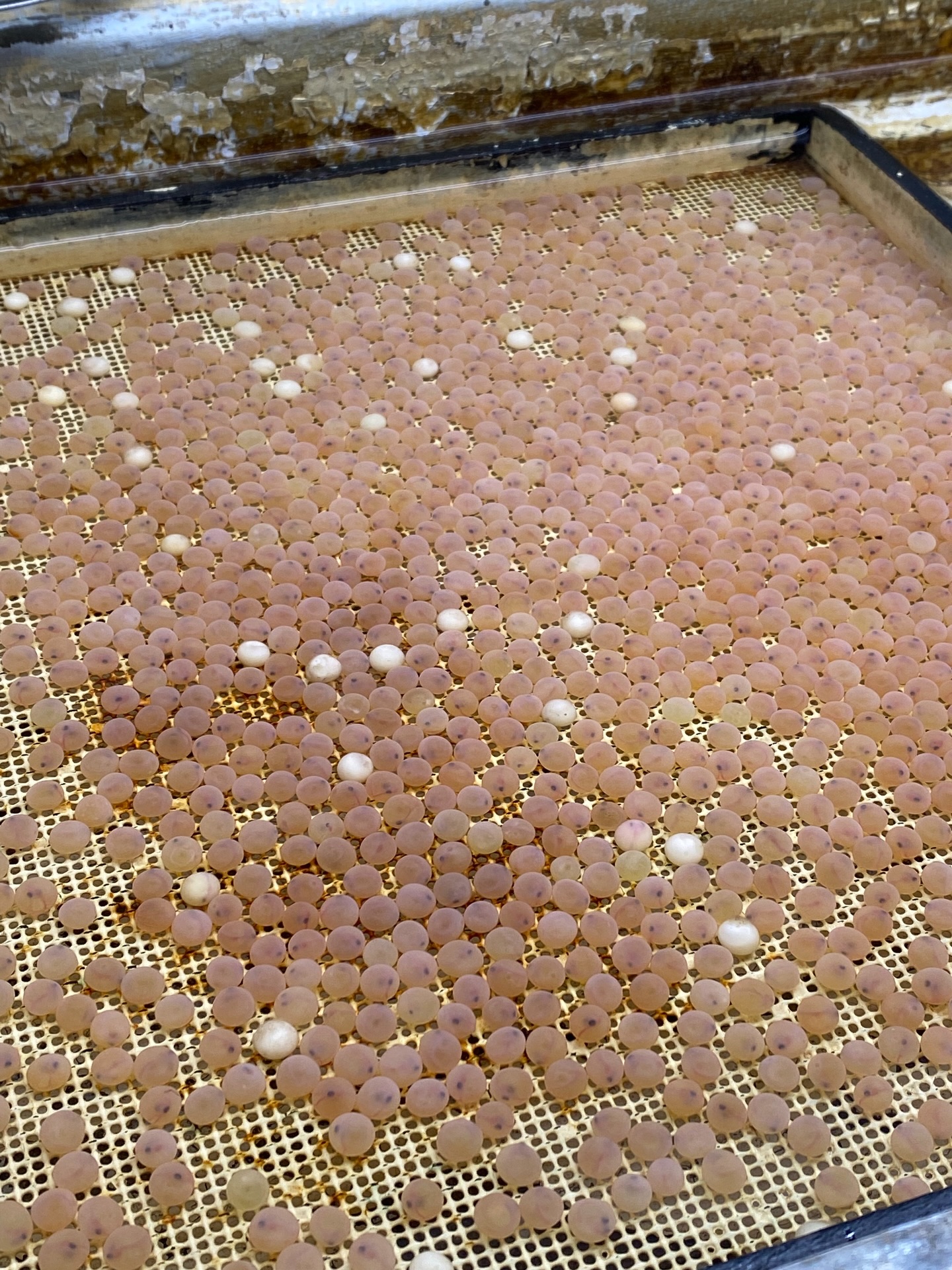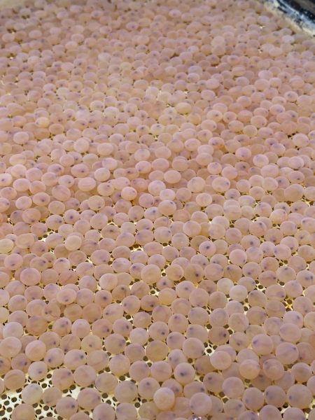 採卵した時は黄色の黄金イクラですが、発眼する頃になると分化が進み、卵が少しずつ血液の色でだいだい色に変化していきます。