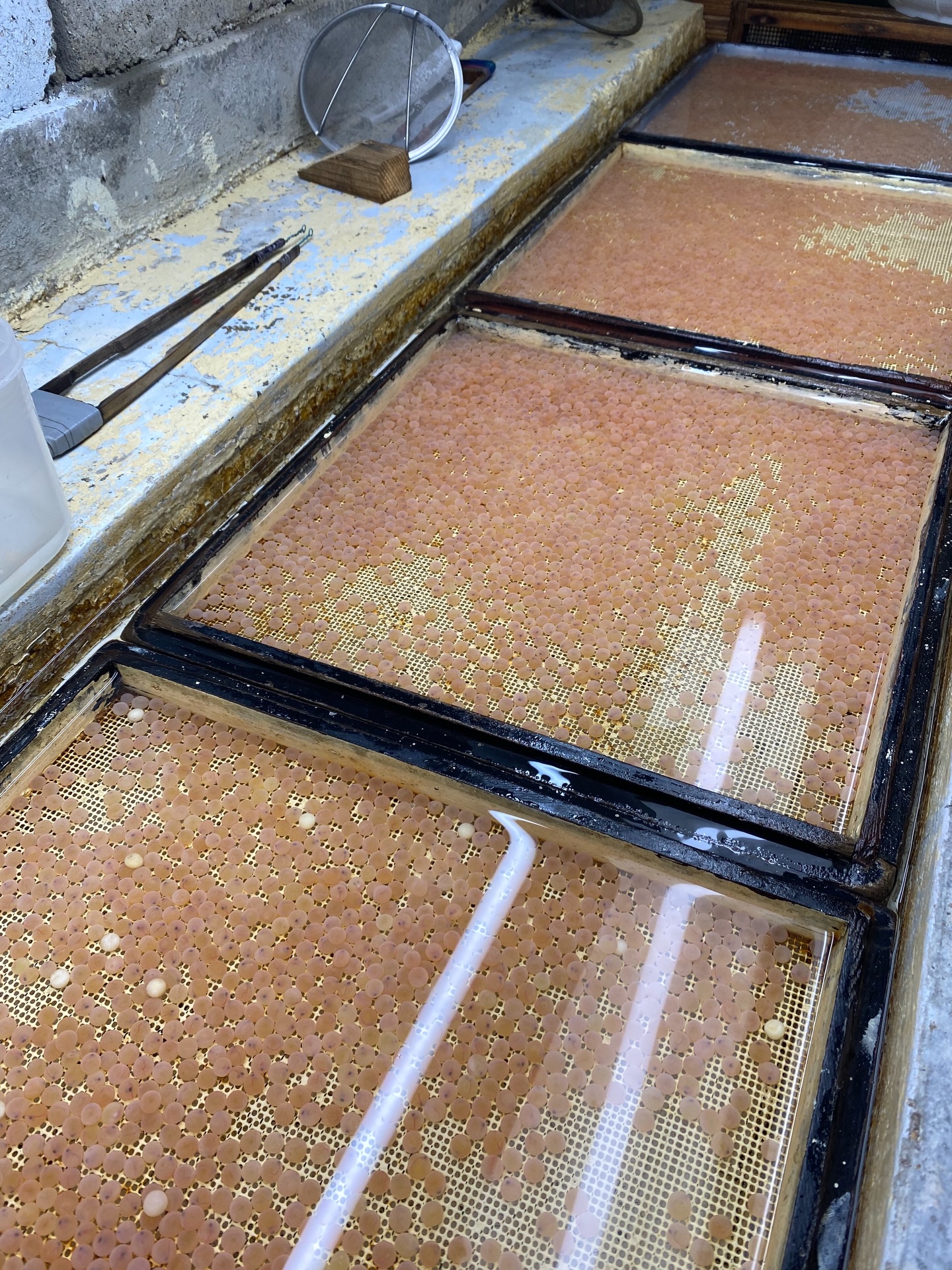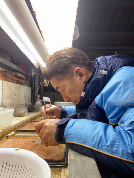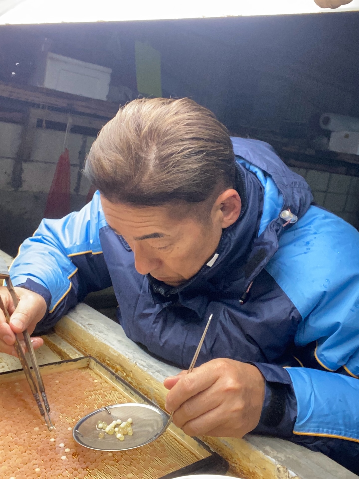 2年の歳月をかけて育て上げたヤマメ親魚から、採卵をして人工授精という神様のような仕事。そこから15日ほどで発眼し検卵作業を行います。