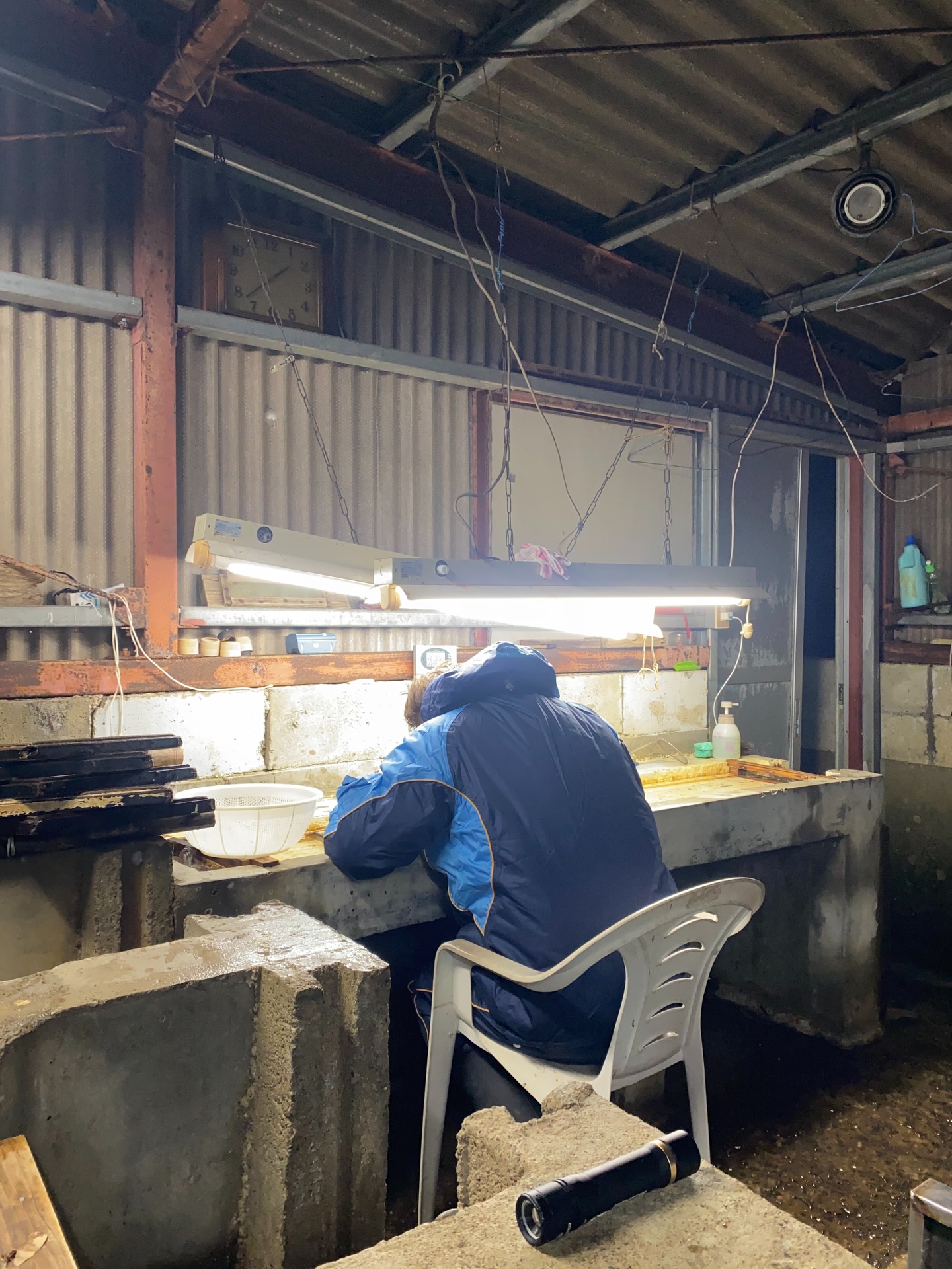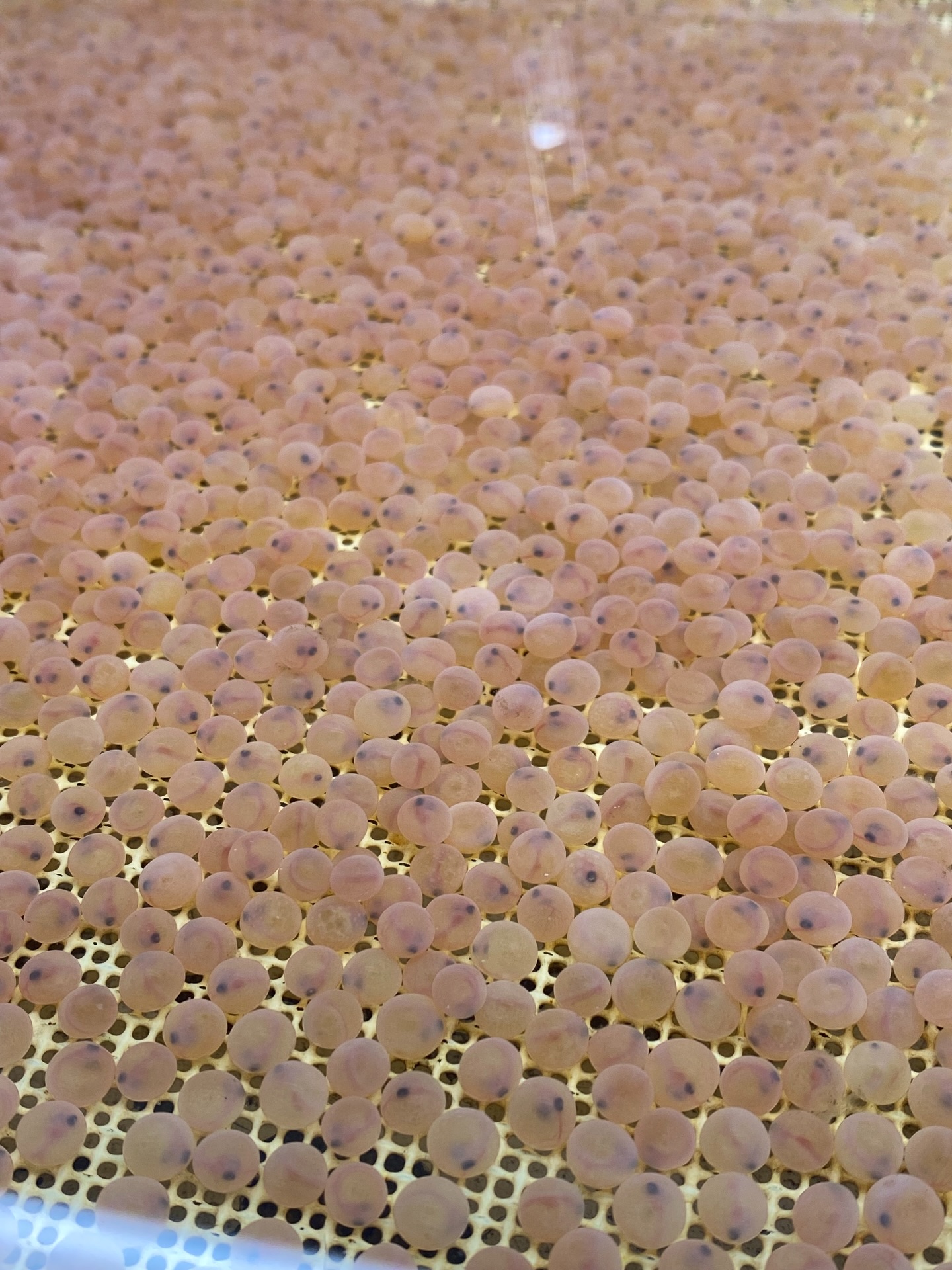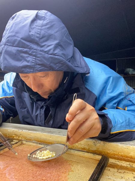 今夜も深夜作業 本日もヤマメの生命(いのち)の時間に合わせて夜間作業。現在夜中の2時。 全体の量から、まだ折り返しに届いてないけれど、毎日コツコツの積み重ねで終わりに近づいて行きます。 受精率も良く、卵質も良いので孵化後の成長もきっと良いでしょう。 しゃくなげの森から全国のヤマメ養魚場に発眼卵が出荷されていきます。