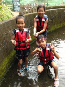 曇り空ですから水温18度の川で泳ぐと寒いです。