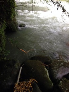 台風の豪雨によってヤマメ養殖場の取水口に木の枝が詰まってしまいました。