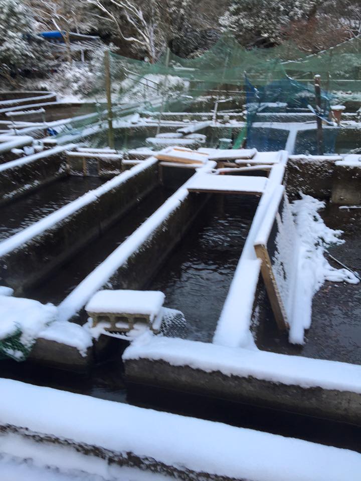 極寒の朝 午前9時なのに気温マイナス4.5度(; ̄O ̄) 南国宮崎ではありますが、山間部にあるしゃくなげの森は極寒で雪化粧。県道33号線はチェーン規制です。 太陽が出てきたので気温が上がることを願うところですが、少しだけ融けて気温が下がるとアイスバーンになるのでそれも心配なところです。 雪の積もった養殖池の水温は5度、低い水温には強いのでヤマメは元気に泳いでいます。さすがに今日は池には入りません。