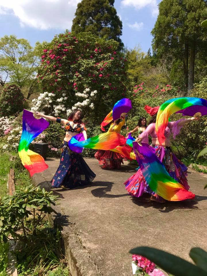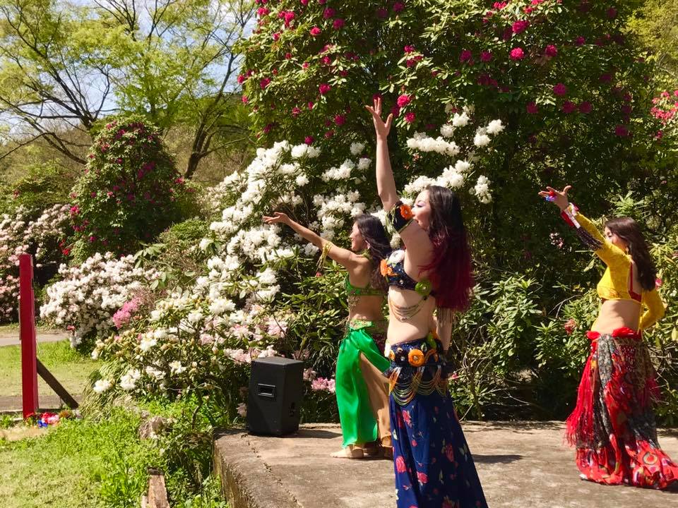 ベリーダンス@しゃくなげの花園 各イベントで大活躍している、ダンサーマキコ率いるベリーダンスチームがしゃくなげの花園で、華麗な舞を披露。 情熱的でミステリアスなステージにお客様は目が点になる人も(笑) 今回は新曲も取り入れていただくという有り難さ。最高の天気の上に、しゃくなげの豪華な花園をバックに、素晴らしいダンスで盛り上げてくださいました。 最後はお客様も一緒に踊ったり楽しいひと時になりました。