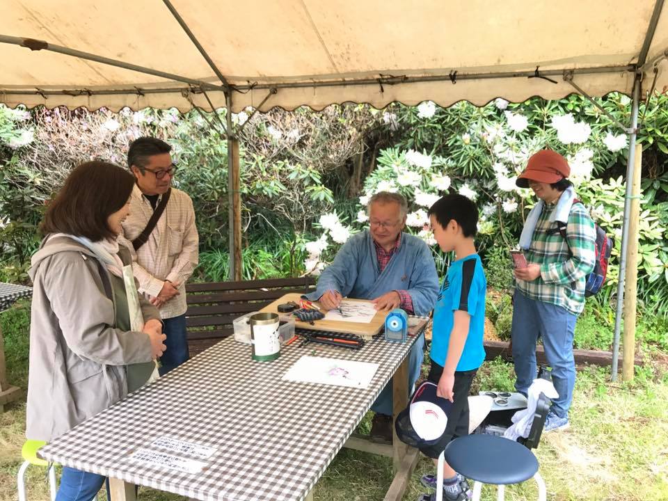 旅絵師鬼源丹こと大西正國さん 旅絵師鬼源丹こと大西正國さんがしゃくなげの森に来てくださいましたー。 大腸ガンで死の淵まで行って元気になった奇跡の人。生きてるなら笑顔で楽しもうと意味深い言葉をいただきました。 朝からずっと絵を描き続け、多くの方と楽しそうに交流されてました。まるで現代に生きる仙人のようです。 しゃくなげは綺麗だけど、ここまで育て上げる苦労に気付く人は何人いるかな〜と、動植物に詳しい自然環境保護推進員らしい一面も。